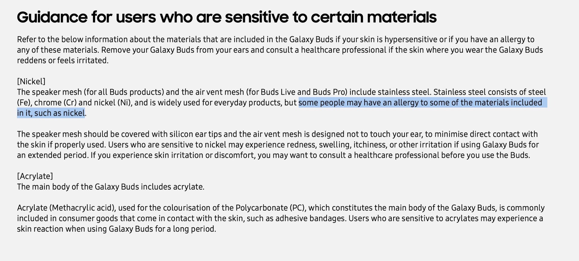 Auf einer Support-Seite deutet Samsung nun an, dass die Ursache eine Allergie sein könnte, denn die Edelstahl-Komponenten der komplett drahtlosen Ohrhörer enthalten Nickel. Das würde zumindest erklären, warum dieses Problem nur bei vereinzelten Nutzern auftritt, denn in Deutschland reagieren rund 15 bis 20 Prozent der Frauen und 5 Prozent der Männer allergisch auf Nickel. Symptome treten in der Regel 24 bis 72 Stunden nach dem Kontakt auf, und äußern sich als starker Juckreiz, Brennen, Schmerzen, Rötung, Schwellung oder Bläschenbildung.