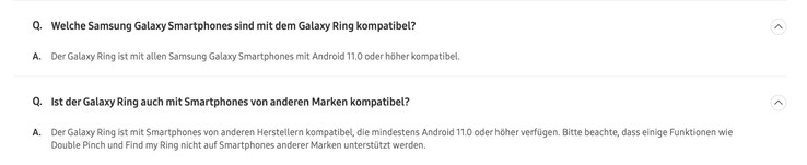 Der Hinweis, dass der Galaxy Ring auch mit Smartphones anderer Hersteller kompatibel ist, solange diese mit Android 11 oder einem neueren Betriebssystem laufen, findet sich erst im Kleingedruckten in der FAQ-Sektion der Produktseite. Die Nutzung mit einem Apple iPhone ist allerdings nicht möglich.