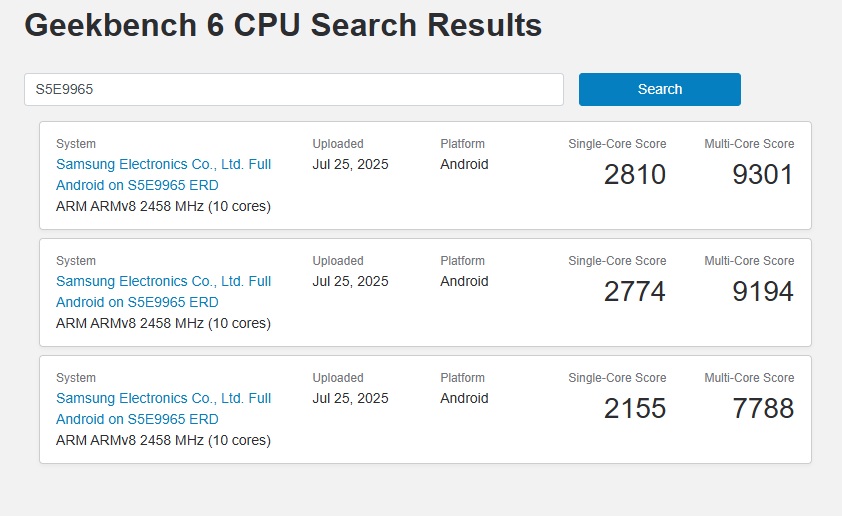 Wenige Stunden nachdem der erste, noch eher enttäuschende Benchmark im Geekbench-Browser aufgetaucht war, sind dort nun auch weitere Ergebnisse zu finden. Und die sehen schon deutlich besser aus, wie der Screenshot unten zeigt. Im zweiten beziehungsweise dritten Run erreicht der vermeintliche Exynos 2600 bis zu 2.810 Punkte im Single-Score und vorerst maximal 9.301 Punkte Multi-Core, womit das Leistungsniveau des Snapdragon 8 Elite mit median 3.120 Punkten SC und 9.980 MC bereits in greifbare Nähe rückt. Das ist zwar für einen Next-Gen-Chip vielleicht immer noch nicht gut genug, zumal der Snapdragon 8 Elite 2 vermutlich deutlich mehr leisten wird, aber es ist auch nicht mehr ganz so miserabel wie anfangs vermutet. Durchaus möglich, dass Samsung in den nächsten Monaten noch mehr Performance aus dem Exynos 2600 herauskitzeln kann.
