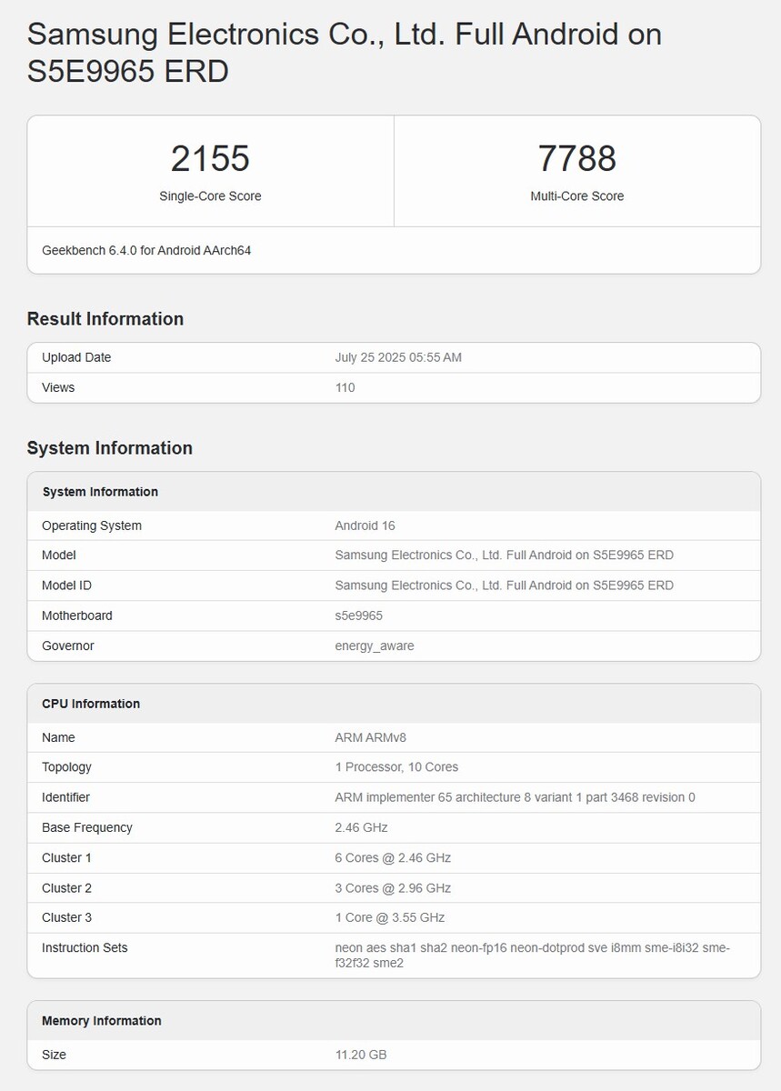 Neu ist offenbar die Unterstützung für die Scalable Matrix Extension (SME), die mit der ARMv9 Architektur eingeführt wurden, wie der Benchmark-Leak verrät (ganz unten bei Instruction Sets) und die eigentlich mehr Performance bringen sollten. Davon ist aber zumindest bei diesem Leak noch nicht viel zu spüren. Die erreichten 2.155 Punkte Single-Core und 7.788 Punkte Multi-Core sind nur wenig mehr als zuletzt beim Exynos 2500 im Samsung Galaxy Z Flip 7 (hier bei Amazon erhältlich) und selbst das gilt im Vergleich zur Konkurrenz eher als Enttäuschung.