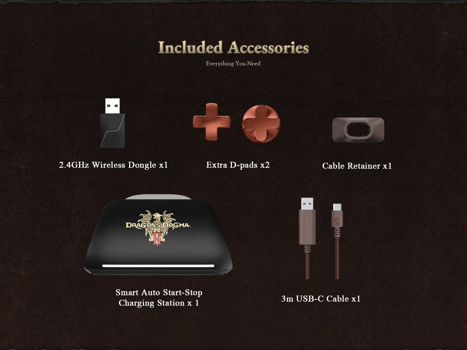 Neben dem Controller und der Ladestation erhalten Käufer auch einen kabellosen 2,4GHz-Dongle, zwei zusätzliche D-Pads mit unterschiedlichen Designs, einen Kabelhalter und ein 3 Meter langes, geflochtenes USB-C-auf-USB-A-Kabel.