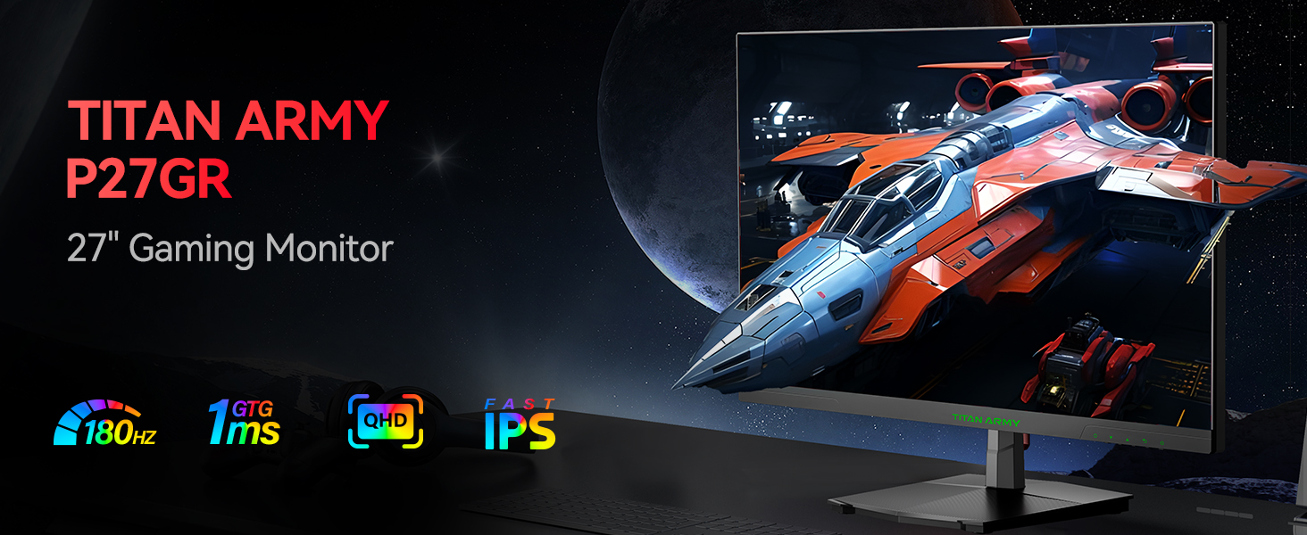 Der P27GR von Titan Army ist ein 27 Zoll großer Gaming-Monitor, der eine 2K-QHD-Auflösung von 2.560 x 1.440p auf seinem Fast IPS-Panel darstellt. Die Bildwiederholrate liegt bei 180 Hz, die GtG-Reaktionszeit beträgt winzige 1 ms. HDR10 und 120 Prozent sRGB-Abdeckung sorgen für eine brillante Wiedergabe, während AMD FreeSync und Nvidia G-SYNC gegen Tearing vorgehen und ein rasantes Gaming-Erlebnis garantieren.