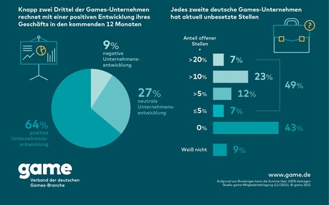 Knapp zwei Drittel der Unternehmen in der Games-Branche gehen trotz Inflation und Konsumflaute für das kommende Jahr 2023 von einer positiven Entwicklung für das eigene Unternehmen aus. 52 Prozent der Games-Unternehmen in Deutschland planen 2023 zudem mehr Mitarbeiter einzustellen. Allerdings herrscht auch in der digitalen Spielebranche ein Fachkräftemangel. Jedes zweite deutsche Games-Unternehmen hat aktuell unbesetzte Stellen.