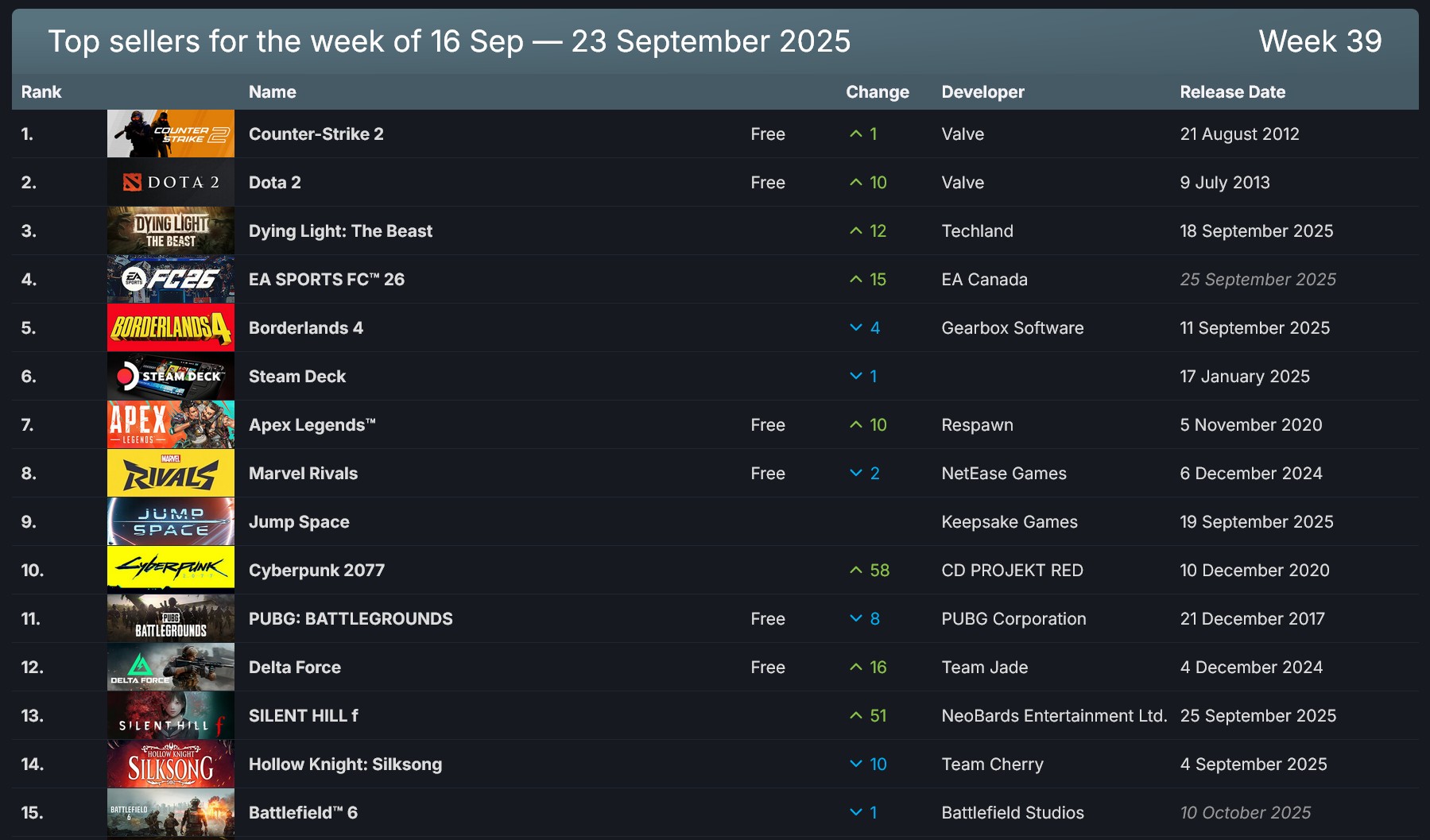 Die PC-Verkaufsrankings nach Umsatz auf Steam zeigen, dass die Free-to-Play-Giganten die Spitze belegen: Counter-Strike 2 und Dota 2 führen die globalen Charts an. Direkt dahinter folgt jedoch der am 18. September veröffentlichte starke Neueinsteiger Dying Light: The Beast auf Platz 3. Die Vorbestellungen für EA Sports FC 26 sind so stark, dass der Titel bereits auf Platz 4 rangiert. Das gilt auch für den Shooter Battlefield 6: Obwohl das Spiel erst am 10. Oktober erscheint, landet es durch hohe Vorbestellungen bereits auf Rang 15 der globalen Steam-Umsatz-Charts – ein deutliches Zeichen für den enormen Hype im Vorfeld des Releases. Die Hardware-Verkäufe des Steam Deck halten sich zudem konstant in den Top 10.