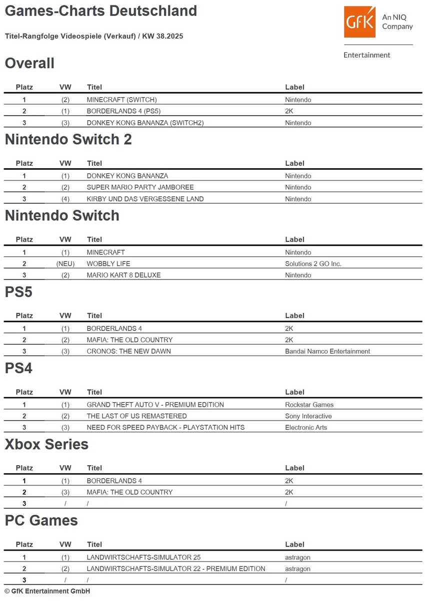 Im plattformübergreifenden Gesamtranking tauschen die Spitzenreiter die Plätze: Das Sandbox-Spiel Minecraft (Switch) kehrt auf den Spitzenplatz zurück und verdrängt den Vorwochen-Ersten Borderlands 4 (PS5) auf den zweiten Rang. Auf dem dritten Platz hält sich Nintendos Donkey Kong Bananza (Switch 2). Die GfK Entertainment ordnet diese Periode als drittschwächste Verkaufswoche des Jahres ein, was die Dominanz etablierter Titel erklärt. Dementsprechend bleiben die Auswertungen für die PS4- und PC-Retail-Charts spannungsarm.