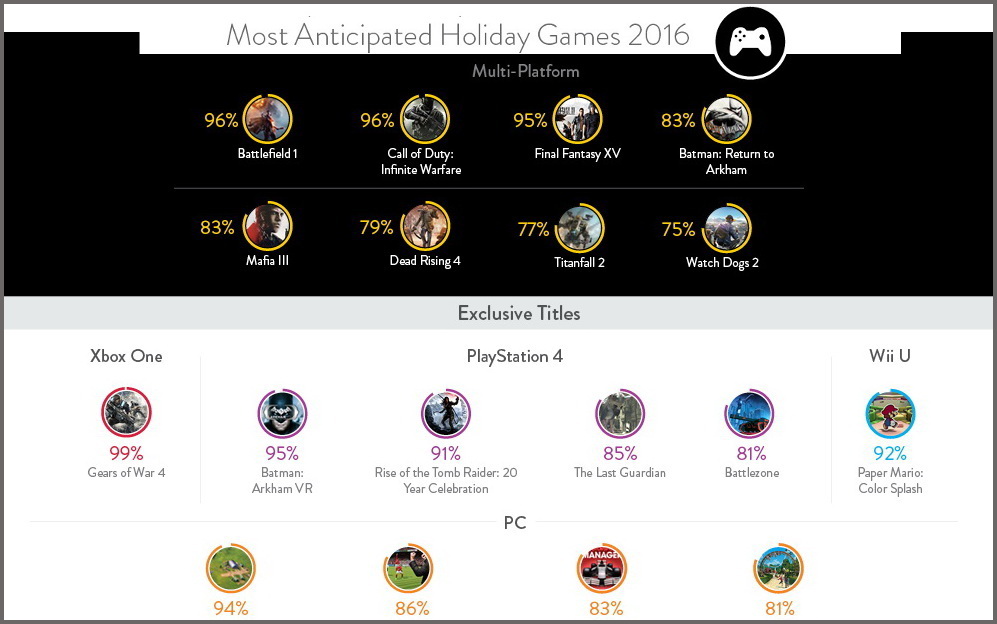 Für den Zeitraum zwischen Oktober und Dezember 2016 dominieren bei der durch Nielsen durchgeführten Umfrage im Bereich der Multiplattform-Games die beiden Ego-Shooter Battlefield 1 von Electronic Arts (EA) und Call of Duty: Infinite Warfare von Activision. Beide First-Person Shooter (FPS) führen die Charts mit jeweils 96 Prozent an. Gleich dahinter rangiert das japanische Action-Rollenspiel Final Fantasy XV von Square Enix mit 95 Prozent.