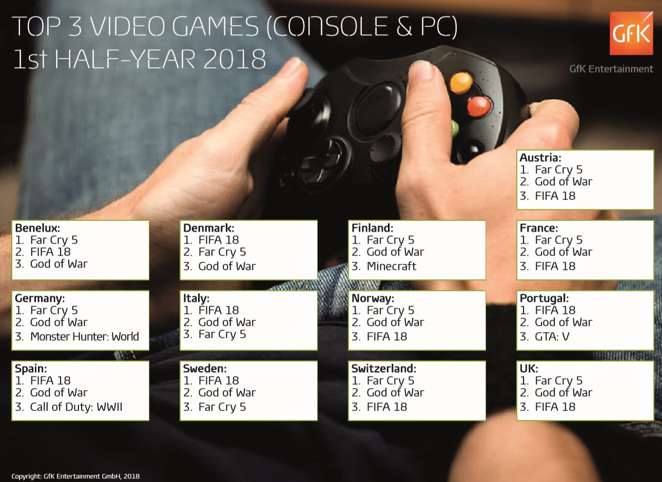 Das war's aber noch lange nicht: God Of War von Sony Interactive Entertainment eroberte in nahezu allen untersuchten Ländern Rang 2. Nur in der Benelux-Region und Dänemark musste sich der Kriegsgott mit dem 3. Rang begnügen. Weitere Abräumer im Zeitraum von Januar bis Juni 2018 waren Monster Hunter: World, Minecraft, GTA V und Call of Duty: WWII. Basis der Auswertung sind die Verkäufe von Computer- und Videospielen im physischen Markt.