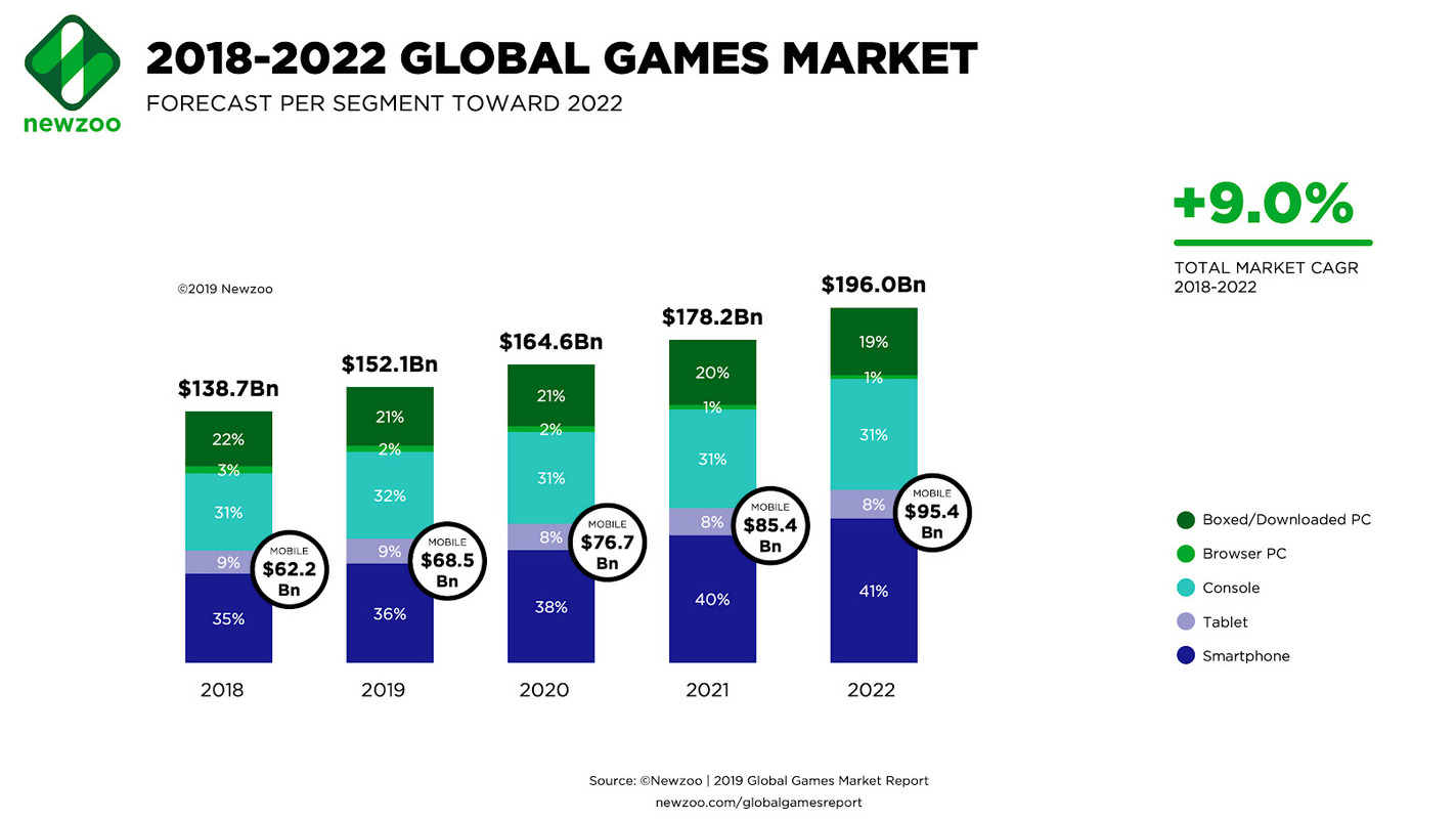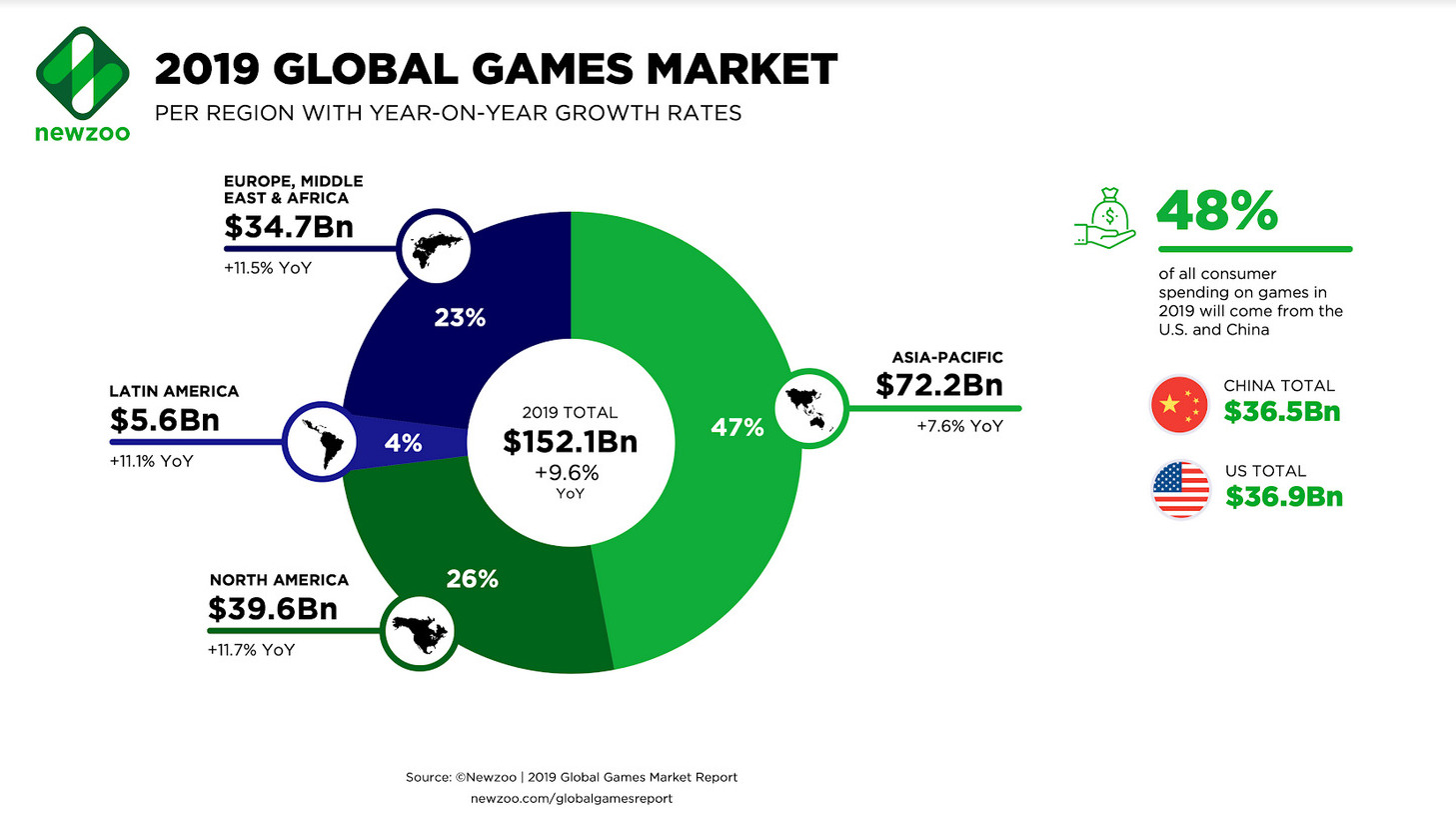 Der weltweite Spielemarkt für Konsolen, PC und Smartphone boomt. Wie die Marktexperten von Newzoo in ihrem neuesten Global Games Market Report 2019 feststellen, wird der globale Markt für Computerspiele, Konsolen-Games und Mobile Game Apps in diesem Jahr einen Umsatz von 152,1 Milliarden US-Dollar erreichen.