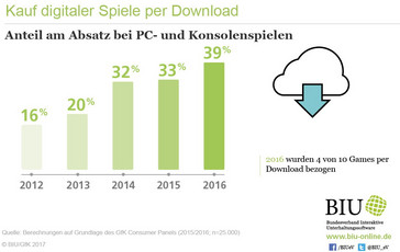 Für das vergangene Jahr 2016 meldet der BIU, dass bereits rund vier von zehn Games für PC und Spielekonsole auf Downloadportalen wie Origin, dem Nintendo eShop, PlayStation Store, Xbox Games Store, Steam oder Uplay gekauft wurden. Im Vergleich zu 2015, als noch jedes dritte Spiel per Download erworben wurde, sei somit der Downloadsanteil bei den Videogames um 6 Prozent gestiegen.
