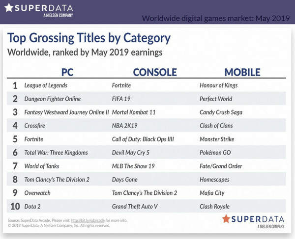 Für Fortnite registrierten die Marktanalysten einen Schub durch Season 9. Die erzielten 203 Millionen US-Dollar über Konsolen, PCs und Smartphone ist zwar gegenüber April deutlich gestiegen, aber im Vergleich zu Mai 2018 um 38 % gefallen. Die FIFA Ultimate Team-Erlöse waren im Vergleich zum Vorjahr mit 93 Mio. Dollar ebenfalls rückläufig. Sehr gut ist es für Total War: Three Kingdoms gelaufen. Laut SuperData hat Sega von seinem neuesten Strategiespiel kurz nach dem Launch bereits mehr als 1 Million Exemplare verkauft.