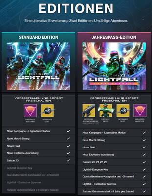 Vorbestellungen für "Destiny 2: Lightfall" sind ab sofort möglich und jeder, der die Lightfall und die Jahrespass-Edition erwirbt, erhält sofort das exotische Automatikgewehr "Quecksilbersturm", Katalysator und Ornament. Die "Destiny 2: Lightfall Standard Edition" beinhaltet die neue Kampagne, den legendärer Modus, die neue Macht Strang, den neuer Zielort Neptun, das neue Raid, die exotische Ausrüstung, Zugriff auf Saison 20, exotischen Geist und ein legendäres Abzeichen.