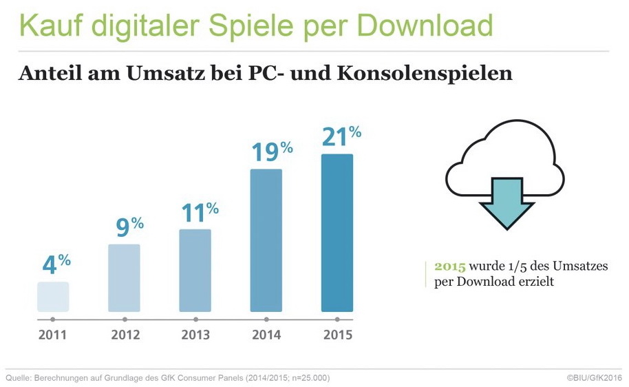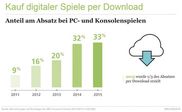 Der Kauf per Download von Computerspielen und Konsolen-Games hat sich auch in Deutschland als Alternative zum Kauf von Spielen auf konventionellen Datenträgern etabliert. Allerdings ist der Anteil von Games, die im Jahr 2015 als digitaler Download gekauft wurden, im Vergleich zu 2014 nur noch leicht, um 1 Prozent von 32 Prozent auf 33 % gestiegen. Im Jahr 2015 wurde demnach jeder dritte Spieletitel für PC und Konsole als kostenpflichtiger Download gekauft.