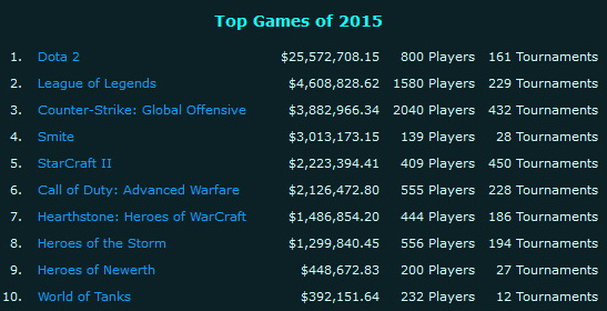 Bei den Top-Games 2015 dominiert Dota 2 mit Preisgeldern in einer Gesamthöhe von fast 26 Millionen US-Dollar. Mit deutlichem Abstand dahinter folgen dann League of Legends, Counter-Strike: Global Offensive, Smite, StarCraft II, Call of Duty: Advanced Warfare, Hearthstone: Heroes of WarCraft, Heroes of the Storm, Heroes of Newerth und World of Tanks.