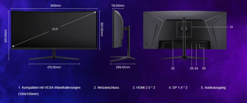 Angegeben wird eine mehr als vollständige Abdeckung des sRGB-Farbraums. Die Ausstattung des Monitors ist relativ sparsam, so gibt es keinen USB-Hub oder etwa einen KVM-Switch. Es stehen jeweils zweimal HDMI 2.0 und DisplayPort für Bildinhalte bereit, zwei Lautsprecher mit einer Leistung von jeweils 5 Watt zählen zur Ausstattung. Beworben wird die Nutzbarkeit an modernen Konsolen, die Ausgabe mit 120 Hz soll dann möglich sein - die Darstellung des Ultrawide-Formats tendenziell eher nicht. Die obligatorische Klinkenbuchse fehlt auch dem VX3418C-2K nicht. Die Montage an einer VESA-Halterung ist möglich, der Monitor kann in der Höhe verstellt, geschwenkt und geneigt werden. Gelistet ist der Monitor bereits für einen Preis von 289 Euro, versandfertig soll der Monitor bei Alternate in 9 bis 15 Werktagen sein.
