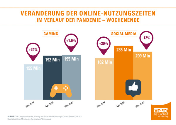 Kinder und Jugendliche im Alter zwischen 11 und 18 Jahren spielten demnach werktags durchschnittlich nur noch 115 Minuten Online-Games - ein Rückgang von 15 Prozent. Auch bei den Sozialen Medien reduzierten sich die Nutzungszeiten in der Woche um fast ein Drittel. Dennoch verbringen Kinder und Jugendliche laut den bisherigen Studienergebnissen nach wie vor mehr Zeit vor dem Bildschirm als vor der Corona-Pandemie.
