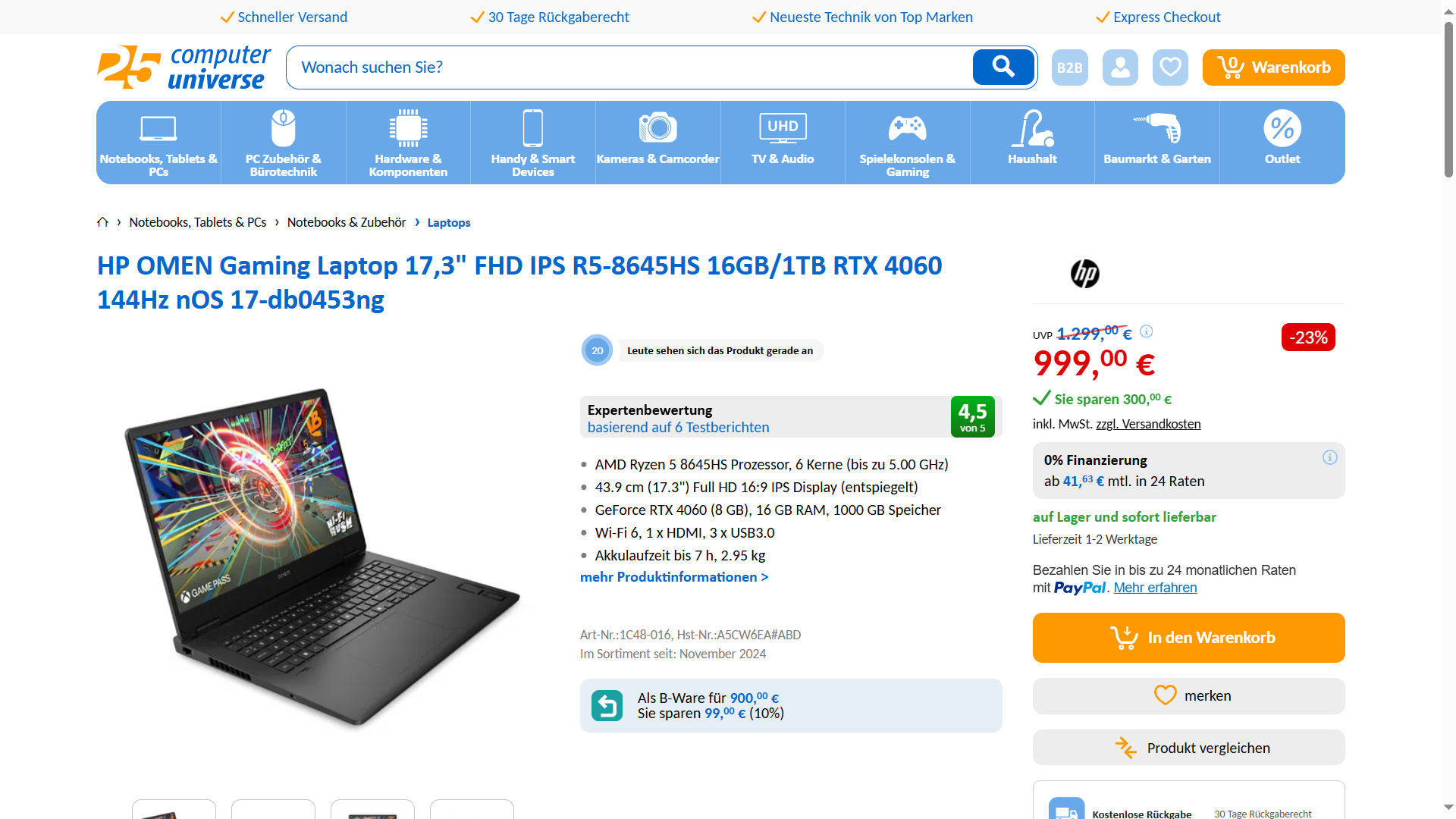 Die Omen-Reihe stellt innerhalb des Sortiments der Firma Hewlett Packard die gehobene Gaming-Linie dar. Aktuell führen Computeruniverse.net und Cyberport.de mit dem Omen 17-db0453ng ein 17,3-Zoll-Modell der Serie zu einem Angebotspreis von 999 Euro im Sortiment. Ein potenteres Schwestermodell musste sich bereits einem Test stellen: Der Rechner ergatterte die Wertung „Gut (80 %)“.
