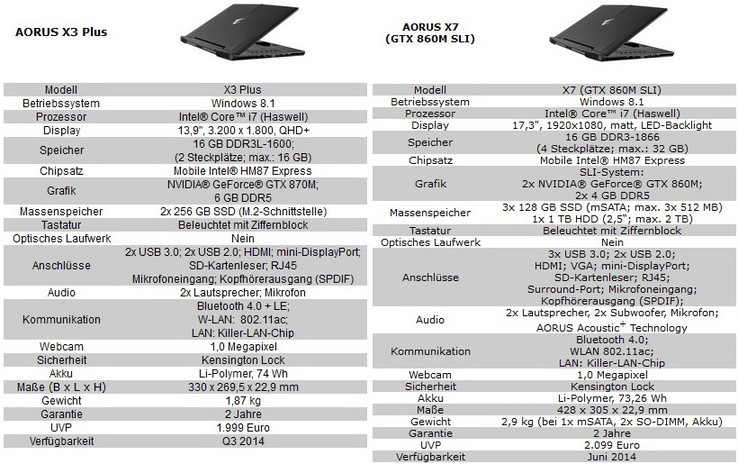 Das Aorus X3 Plus wird zu einer UVP von rund 2000 Euro im 3. Quartal 2014 im deutschen Handel erhältlich sein. Der flache Gaming-Bolide Aorus X7 soll es noch im Juni ab 2100 Euro in den deutschen Handel schaffen.