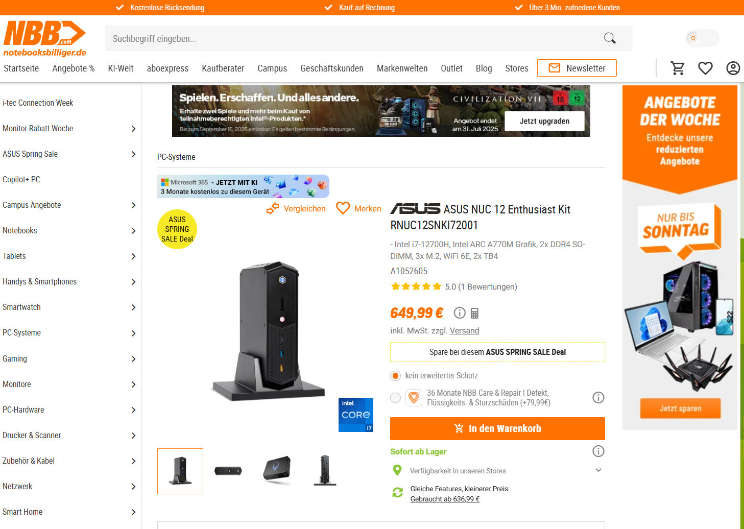 Gaming-PCs im Mini-Format stellen heutzutage keine Seltenheit dar. Diverse Hersteller führen entsprechende Modelle im Sortiment. Aktuell hält Notebooksbilliger.de mit dem Asus NUC 12 Enthusiast Kit RNUC12SNKI72001 einen sehr kompakten Gaming-Barebone zu einem Preis von 649,99 Euro zum Kauf bereit. Ein noch unter Intels Ägide (Asus übernahm die NUC-Sparte vor zwei Jahren von Intel) gefertigtes Modell musste sich bereits unserem Test stellen.