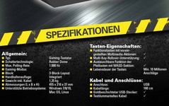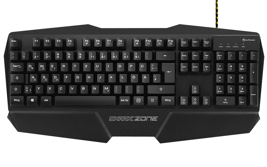 Der nützliche Gaming-Modus mit deaktivierter Windows-Taste kann am Shark Zone K15 Gaming-Keyboard ebenfalls über eine einfache Tastenkombination ausgewählt werden. Auf Wunsch lassen sich zudem alle Tasten des Keyboards sperren. Auch die Funktion der Pfeiltasten kann virtuell mit den WASD-Tasten ausgetauscht werden. Anschluss findet das Gaming-Keyboard von Sharkoon per schwarzgelbem, textilummanteltem Kabel mit goldbeschichtetem USB-Stecker.