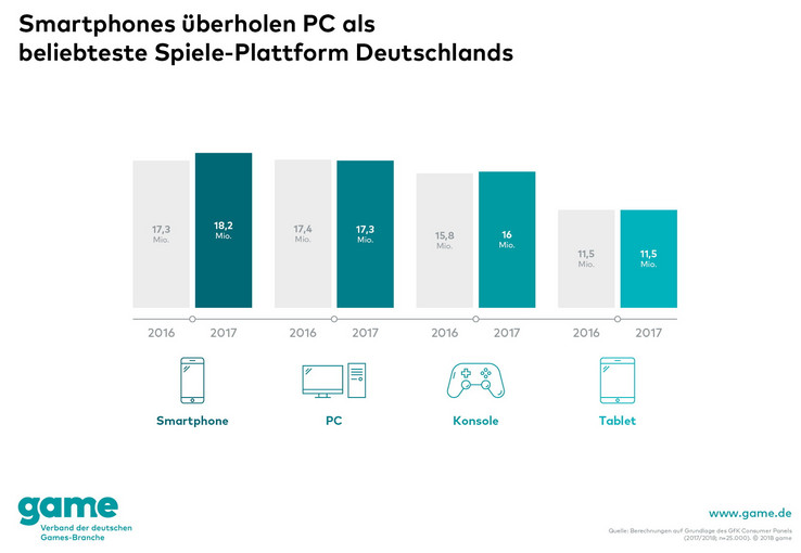 Grafisch besonders aufwändige und realistische Spiele bleibe zwar nach wie vor die Domäne des klassischen Gaming-PCs, allerdings spielen in Deutschland regelmäßig etwa 18,2 Millionen Menschen auf dem Smartphone. Diese Zahl ermittelte game für 2017. Im Vergleich dazu lag die Zahl der Smartphone-Gamer im Jahr 2016 noch bei 17,3 Mio.