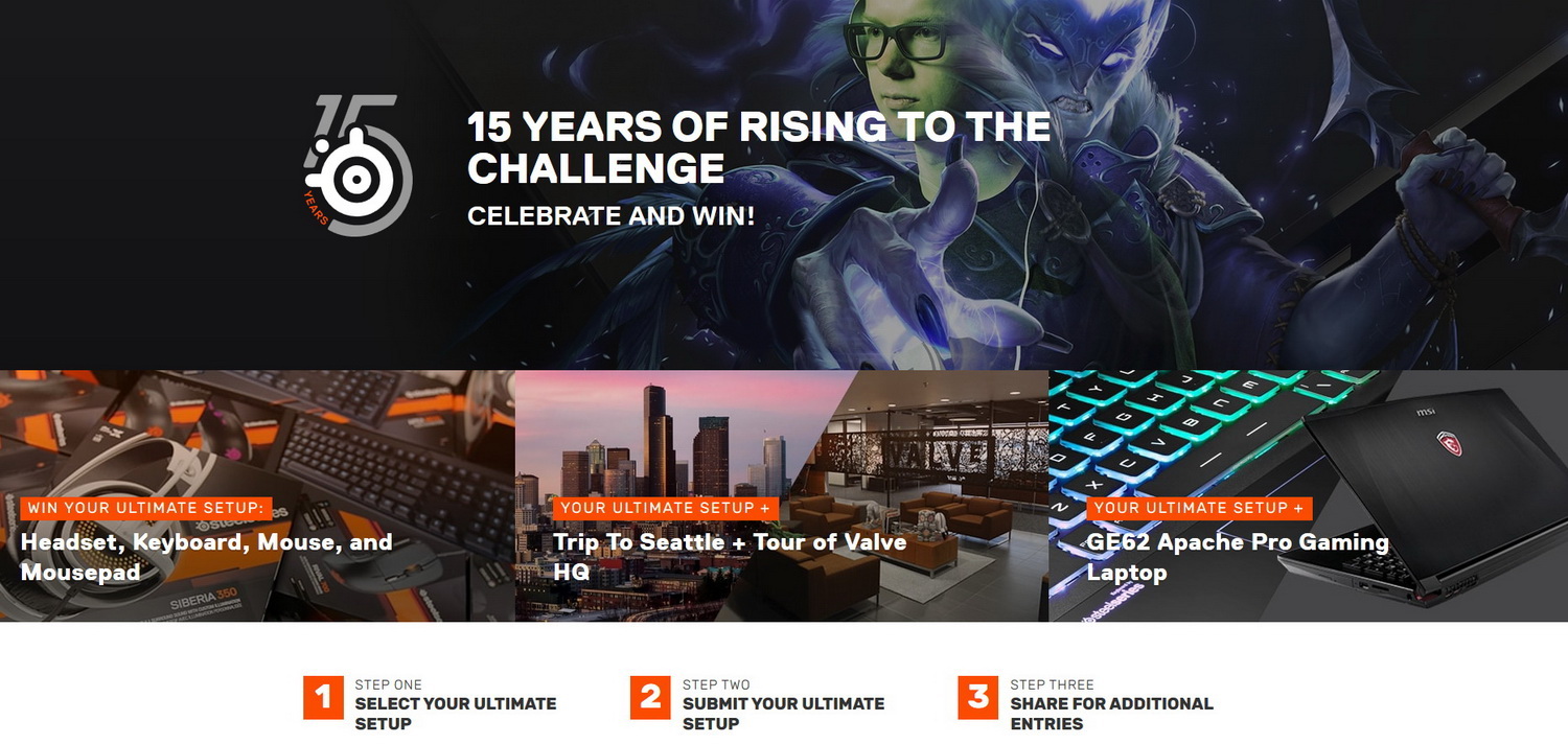 Alle SteelSeries-Fans können ab sofort an dem Gewinnspiel "Your Ultimate Setup" auf www.steelseries.com/15 teilnehmen. Bei der Registrierung stellen sich die Teilnehmer ein vierteiliges Peripherie-Set zusammen und erhalten im Anschluss eine URL. Wer diese mit seinen Freunden teilt, erhöht seine Chance zu gewinnen.