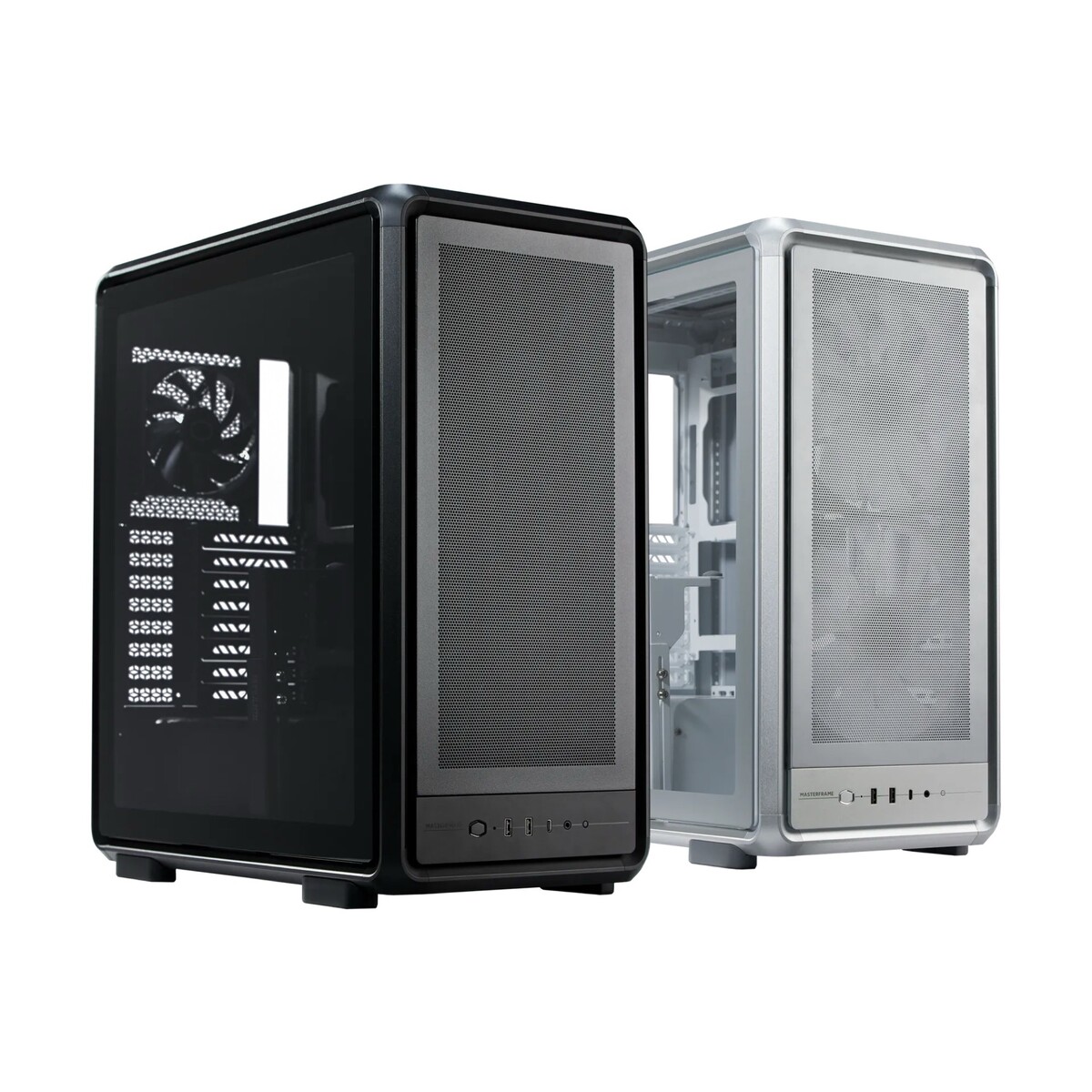 Denn das MasterFrame 500 Mesh unterstützt sogar E-ATX- und XL-ATX-Mainboards sowie Grafikkarten mit einer Länge von bis zu 39 Zentimetern. Das Gehäuse bietet Platz für ein maximal 23,5 Zentimeter langes ATX-Netzteil, für einen bis zu 19 Zentimeter hohen CPU-Kühler und für eine 3,5 Zoll Festplatte. An der Vorderseite finden sich zwei USB-A-Ports (5 Gbit/s), einmal USB-C (20 Gbit/s) und ein 3,5 mm Kopfhöreranschluss.
