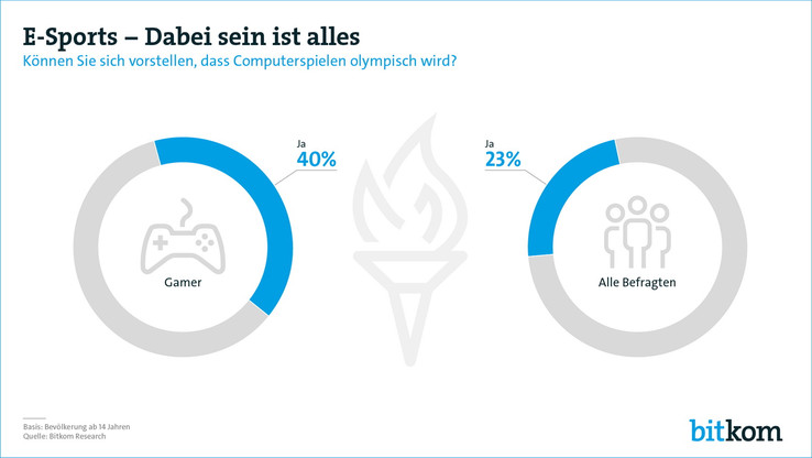 Vor allem Jüngere sehen olympisches Potential im E-Sport: In der Generation der 14- bis 29-Jährigen können sich 38 Prozent vorstellen, dass eSport in naher Zukunft als olympische Disziplin anerkannt wird. Unter den Gamern in dieser Altersgruppe sind es sogar 45 Prozent.