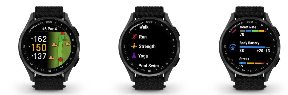 Verbaut ist ein 1,2 Zoll großes AMOLED-Display mit einer Auflösung von 390 x 390 Pixeln. Der interne Speicher ist 4 Gigabyte groß. Auf der Uhr lassen sich Informationen und auch Karten von Golfplätzen speichern, allerdings nicht etwa so umfangreiches Kartenmaterial wie bei den Fenix-Uhren. Wie die Approach S44 auch, unterstützt die S50 etwa die Anzeige eines Kalenders, die Steuerung der Musikwiedergabe und etwa auch die direkte Anzeige des Morgenberichts. Es stehen viele verschiedene Sportprofile bereit, auch etwa zum Laufen, Klettern und Bouldern, aber auch etwa Ausflüge mit einem Stand-Up-Paddle. Etwa die Herzfrequenzvariabilität lässt sich beim Training ebenso bestimmen, die maximale, relative Sauerstoffsättigung soll sich zumindest abschätzen lassen. Beim Golfen lässt sich auch etwa die Richtung zum Loch auf der Smartwatch anzeigen.