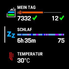Enduro zählt die Schritte, transferiert die überwundenen Höhenmeter in Etagen und vergleicht beides mit dem gesetzten Tagesziel. Für das Konto der angestrebten Intensitätsminuten zählen bei Garmin Aktivitäten mit hoher Intensität doppelt.