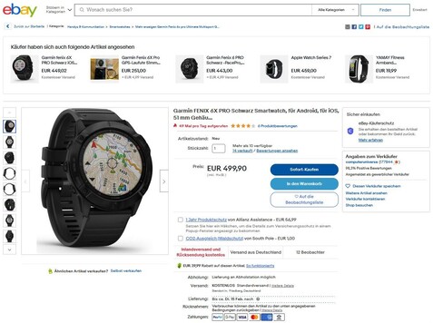 Das ist bis auf wenige Cent der absolute Bestpreis für die Garmin Fenix 6X Pro. Minimal günstiger war die Top-Smartwatch von Garmin nur zu Weihnachten im vergangenen Jahr. Verkauft wird die Fenix 6X Pro Smartwatch im eBay-Deal von Computeruniverse. Um an den Tiefstpreis für die Fenix 6X Pro zu kommen, müsst ihr den Code POWEREBAY8 in Höhe von 39,99 Euro an der Kasse eingeben. Der Gutschein läuft am 11. Februar 2022 ab. Nach Einlösen des eBay-Codes zahlt ihr dann für die Fenix 6X Pro den Sparpreis von nur knapp 460 Euro.