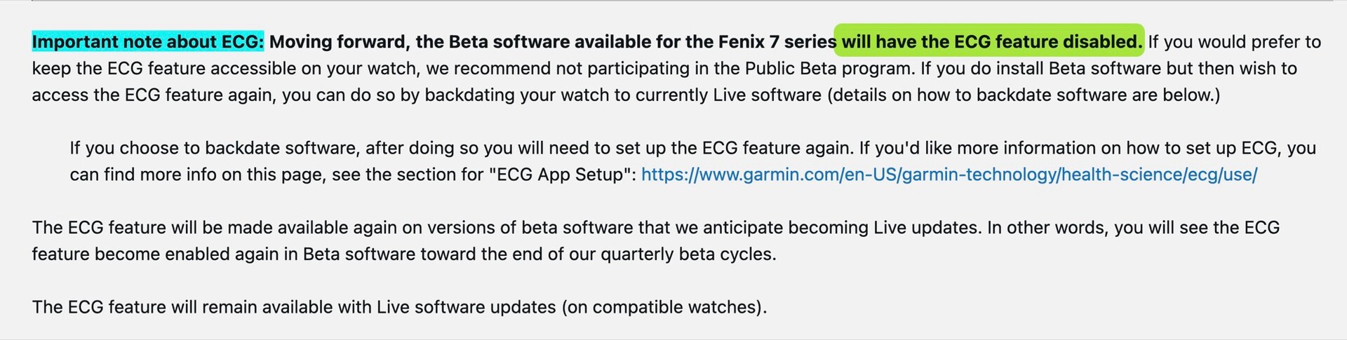 Garmin hat vor rund einer Woche damit begonnen, die Beta-Version des Firmware-Updates 16.11 an Nutzer der Fenix 7, der Fenix 7 Pro, der Epix (Pro), der Enduro 2, der Quatix 7 und der MARQ Gen 2 zu verteilen. In einem Update der Release Notes warnt Garmin nun aber davor, dass Beta-Updates zumindest bei der Fenix 7-Serie künftig mit deaktiviertem Elektrokardiogramm-Feature ausgerollt werden.