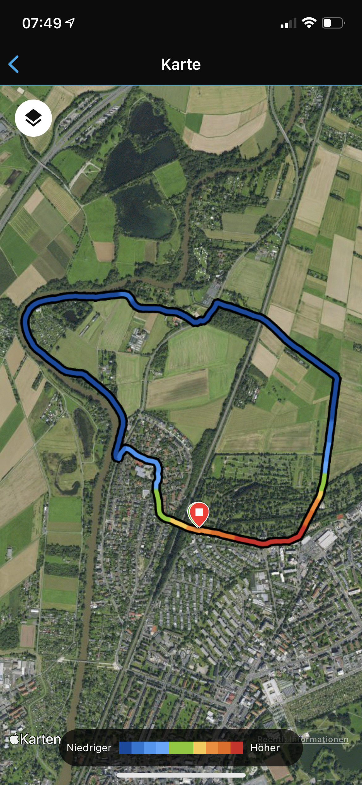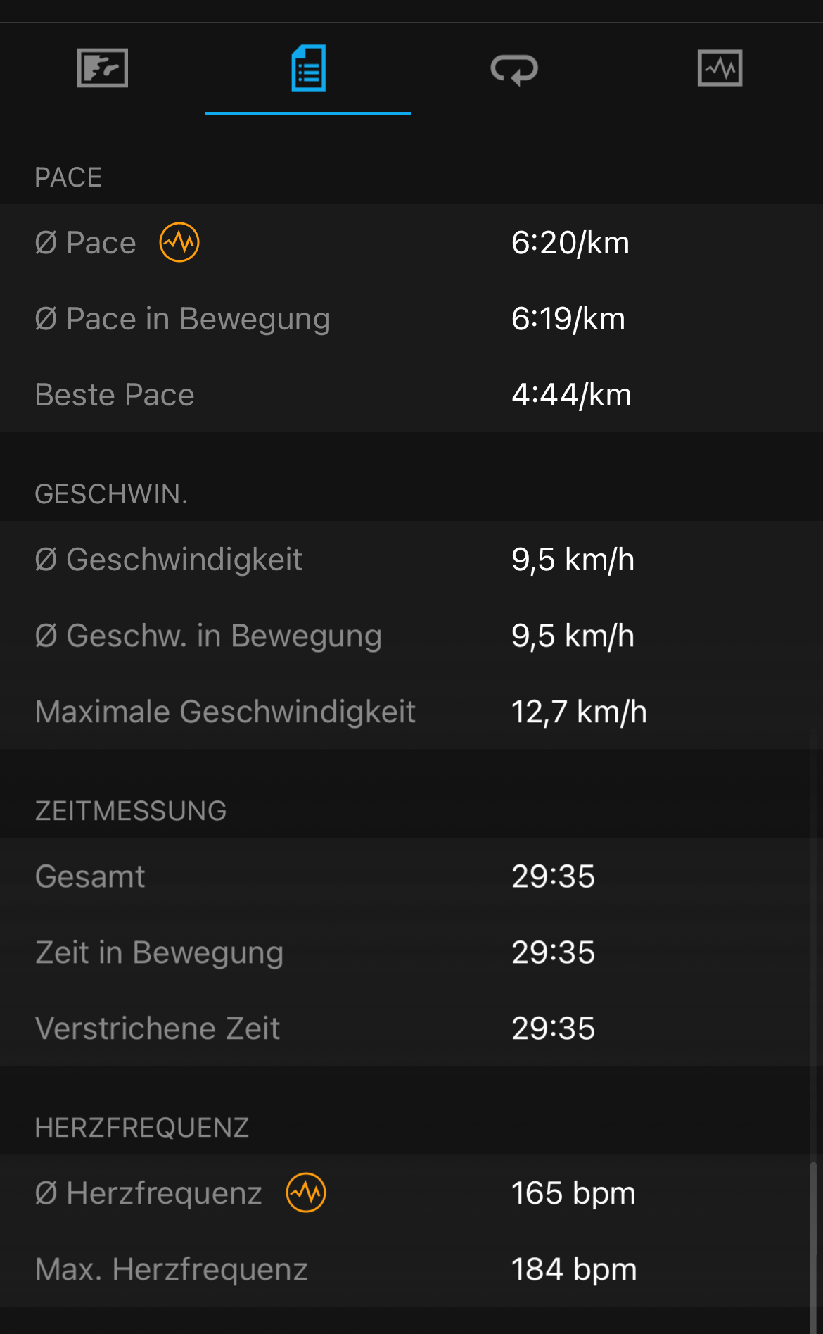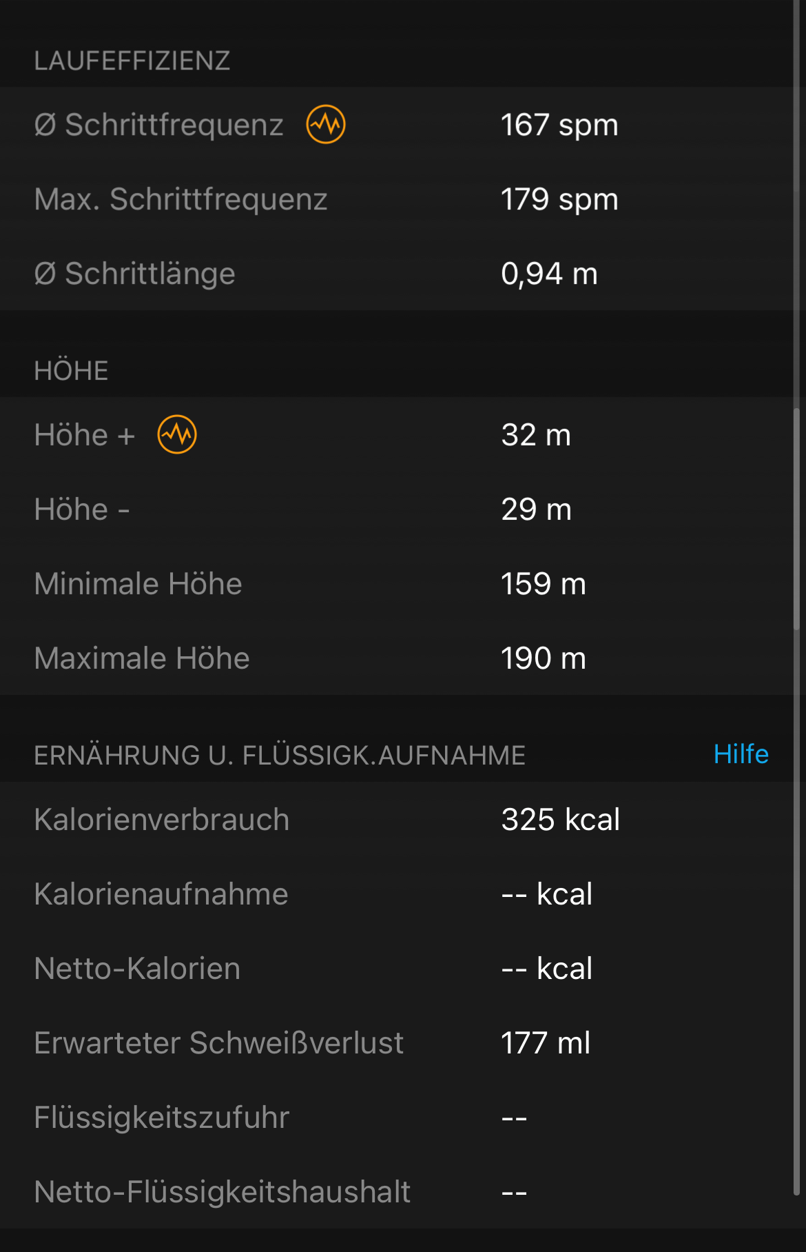 Die nachfolgenden Screens repräsentieren ein Laufprotokoll in der App und auf der Watch. In der App zeigt die Karte alternativ zum Tempo wahlweise die Höhenunterschiede, wie im zweiten Screen zu sehen, oder den Verlauf der Herzfrequenz. Die Rundenzeiten ergänzt sie im Querformat um weitere Details wie Höhenunterschied, Schrittfrequenz und -länge sowie das durchschnittliche und maximale Tempo in den einzelnen Runden.