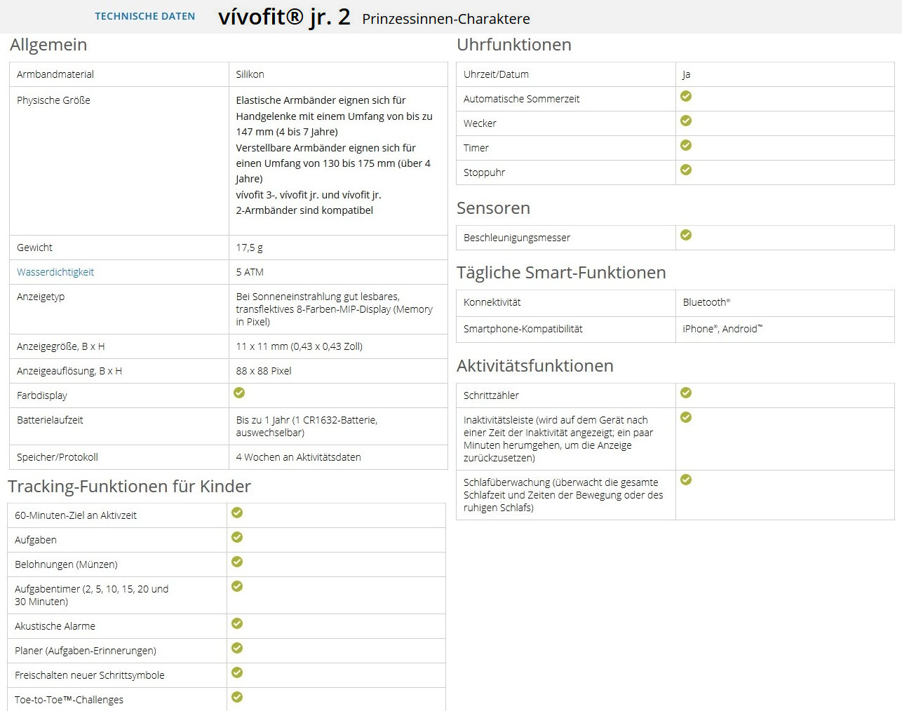 Die robuste vívofit jr. 2 integriert ein anpassbares Farbdisplay und verfügt über ein bequemes Armband, das für die Serie Disney Princess in zwei Farben erhältlich ist. Auf dem lilafarbenen Armband sind Prinzessinnen-Charaktere abgebildet, auf dem Band in Rosa tummeln sich Arielle, Belle, Jasmin, Mulan und Rapunzel alle auf einem Armband. Mit der App entdecken die Kids nicht nur neue Abenteuer, sondern lernen zusammen mit ihren Lieblingsfiguren, aktiv zu sein.