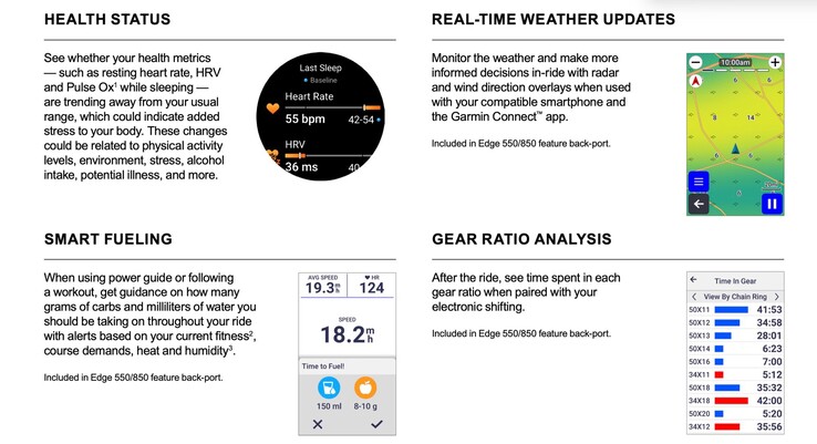 Das Update erweitert die genannten Garmin Edge Fahrradcomputer darüber hinaus um eine Reihe neuer Funktionen. "Smart Fueling" kann berechnen, wie viel Wasser und wie viele Gramm an Kohlehydraten konsumiert werden sollten, um den Bedarf für das laufende Workout zu decken. Garmin führt Echtzeit-Wetter-Updates und eine Analyse der Schaltung ein, wobei diese nur in Verbindung mit einer elektronischen Schaltung funktioniert. Garmin GroupRide erlaubt es nach dem Update, die eigene Geschwindigkeit und Herzfrequenz mit dem Durchschnitt der Gruppe zu vergleichen.