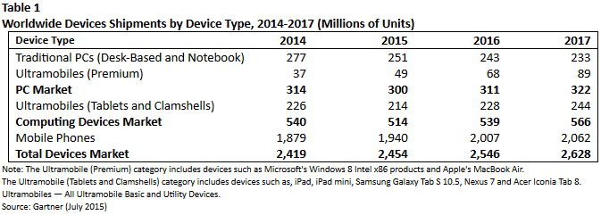 Für das weltweite PC-Liefervolumen erwartet Gartner für das Jahr 2015 einen Rückgang um 4,5 Prozent auf 300 Millionen Einheiten. Vor allem betroffen sind traditionelle Personal Computer wie Desktops und Notebooks. Aber auch für das Marktsegment der Ultramobiles mit Tablets und Clamshells rechnen die Marktbeobachter mit einem geringeren Absatz. Wegen der einsetzenden Marktsättigung in wichtigen Märkten wie China, verlangsamt sich auch das Wachstum im Bereich der Mobiltelefone in diesem Jahr.
