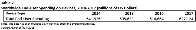Gemäß der Prognose von Gartner werden die Endverbraucher in diesem Jahr das erste Mal seit 2010, mit 606 Milliarden US-Dollar, um rund 5,7 Prozent weniger ausgeben als die Jahre zuvor. 2014 kauften die Verbraucher noch Computer und Mobiltelefone im Gesamtwert von 642 Mrd. Dollar. Als Gründe für den Rückgang sieht Gartner vor allem die höheren Preise wegen dem starken Dollar und eine geringere Nachfrage für Personal Computer in Japan, Russland und Westeuropa.