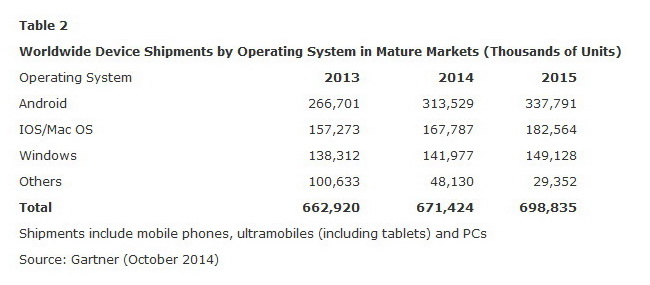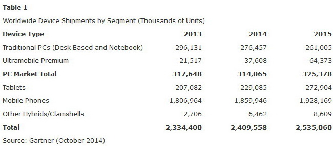 Gartner geht davon aus, dass in diesem Jahr insgesamt 2,4 Milliarden Personal Computer (PC), Tablets, Ultramobiles und Mobiltelefone verkauft werden, die Gartner mit dem Begriff "Devices" zusammenfasst. Dies entspricht einem Anstieg von 3,2 Prozent gegenüber dem Vorjahr 2013. Während der Markt für Desktops und Notebooks weiter schrumpft, könnte das Marktsegment der Hybrid-Rechner (Convertibles, Multimodes) deutlich zulegen. Bei den Betriebssystemen dominiert weiter Googles Android vor Apples iOS und Mac OS sowie Windows von Microsoft.