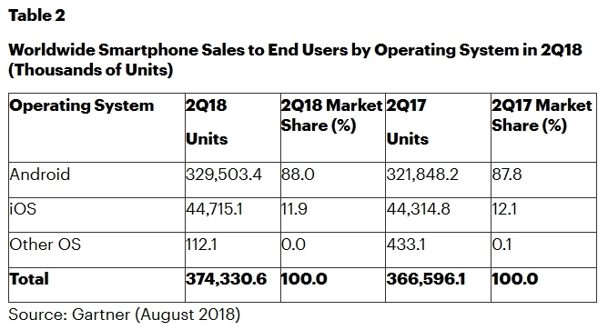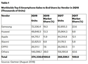 In der Auswertung der weltweiten Absatz- und Lieferzahlen für Smartphones kommen die Analysten von Gartner zu dem Ergebnis, dass Huawei im zweiten Quartal 2018 mit fast 50 Millionen Mobiltelefonen deutlich mehr Smartphones an Endkunden verkauft hat, als der Konkurrent Apple iPhones. Für Apple weisen die Gartner-Marktanalysten in Q2/2018 rund 45 Mio. iPhones aus.