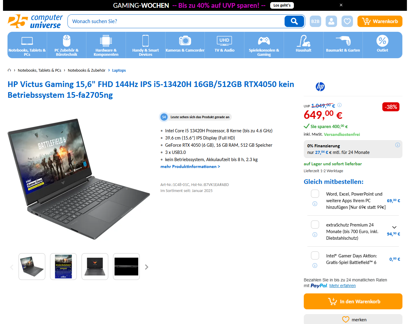Alle großen Notebookhersteller führen eine Reihe von günstigen Gaming-Notebooks in ihren Sortimenten. Die entsprechende Serie der Firma Hewlett Packard firmiert unter der Bezeichnung „Victus“. Aktuell führen Cyberport.de und Computeruniverse.net mit dem Victus 15-fa2705ng einen Vertreter der Reihe zu einem Angebotspreis von 649 Euro im Sortiment. Ein Schwestermodell absolvierte unseren Test mit der Bewertung „Gut (84 %“).