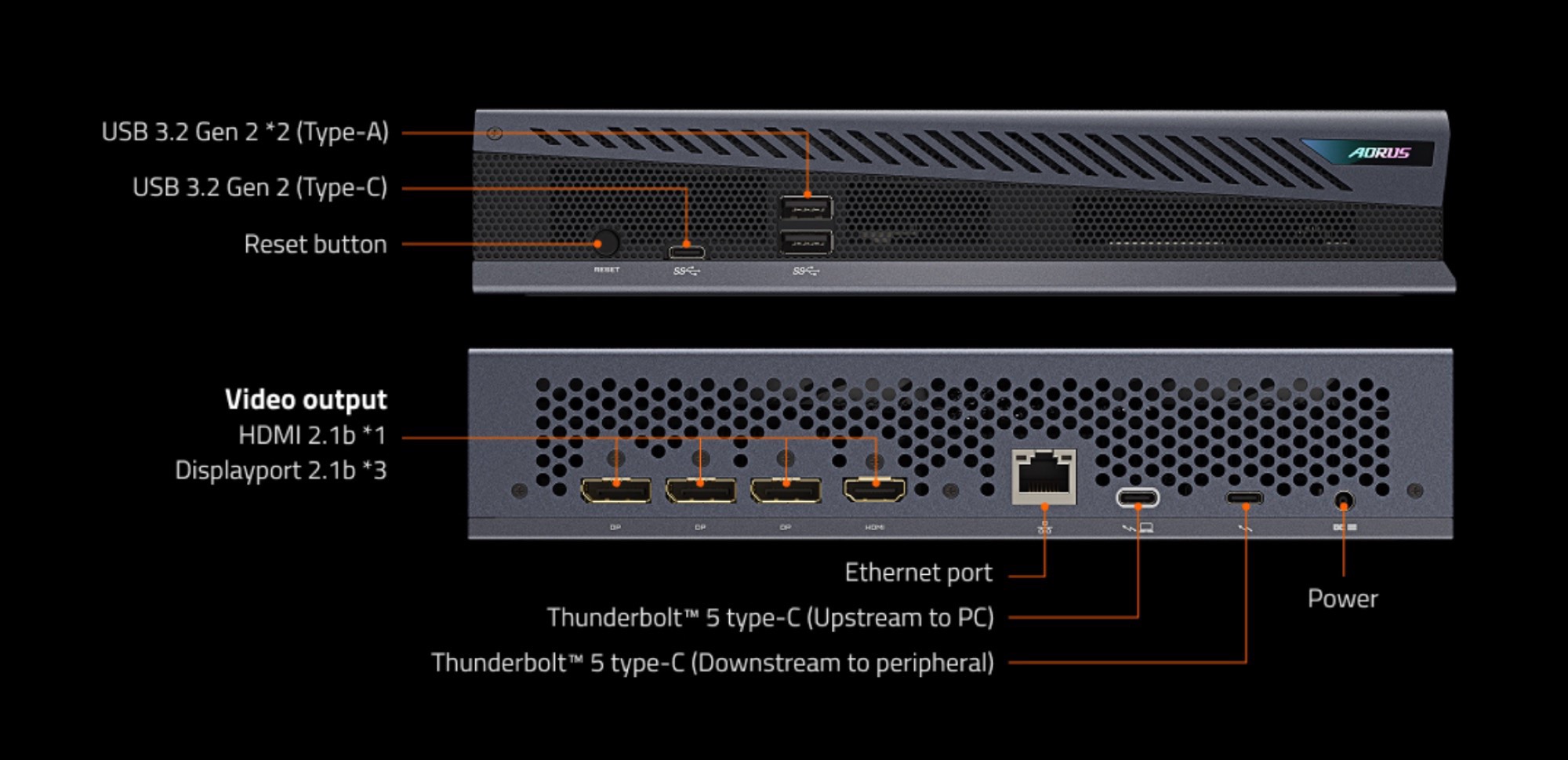 Durch dreimal DisplayPort 2.1b und einmal HDMI 2.1b können vier Monitore zeitgleich angeschlossen werden. Angeschlossene Laptops können über dasselbe USB-C-Kabel mit bis zu 100 Watt aufgeladen werden. Die Nvidia GeForce RTX 5060 Ti Desktop-Grafikkarte im Inneren der Gigabyte Aorus AI Box erreicht GPU-Taktraten bis 2.572 MHz. Laut Gigabyte eignet sich die eGPU sowohl für Gaming-Enthusiasten als auch für kreative Profis und für AI-Entwickler.