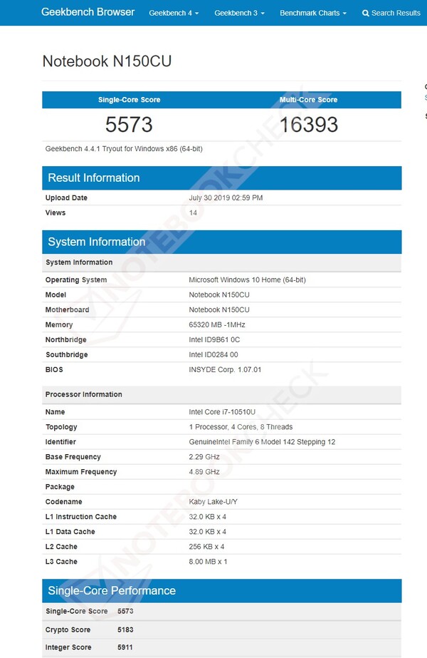 Im Single-Core erzielt das N150CU einen Score von 5.573 Punkten, im Multi-Core-Benchmark erzielt das Laptop 16.393 Punkte. Geekbench listet für den Intel Core i7-10510U einen Basistakt von 2,29 GHz sowie eine maximale Taktfrequenz von 4,89 GHz.