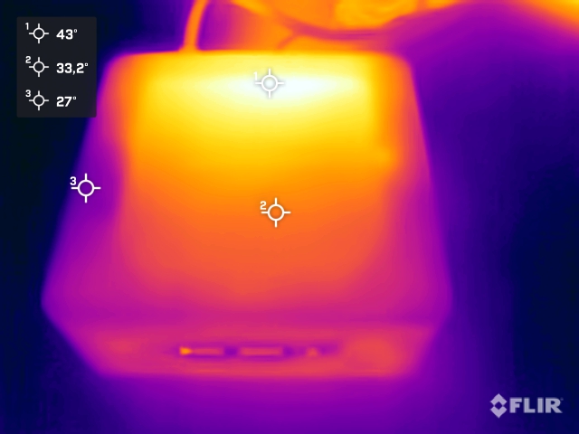 (±) Ohne Last messen wir eine durchschnittliche Temperatur von 32.4 °C auf der Oberseite. Der Klassendurchschnitt erreicht 32.5 °C.