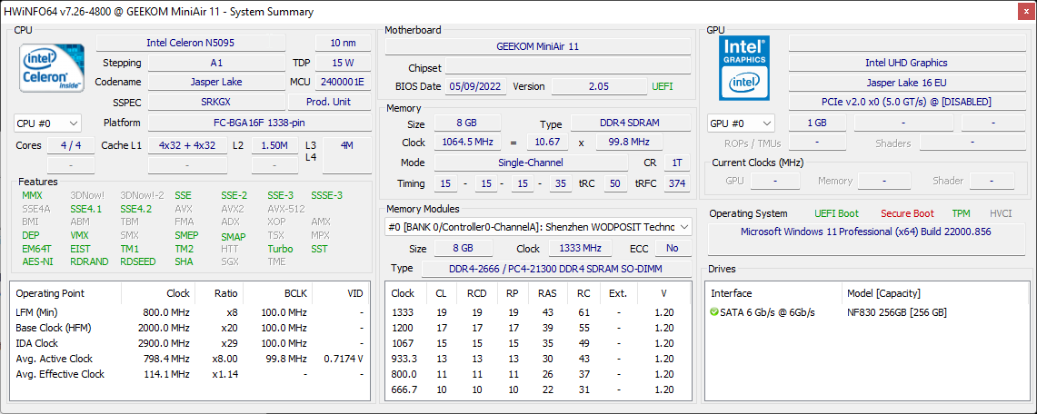| Geekom MiniAir 11 NF830 256GB M.2 2280 | Beelink U59 Mini-S Silicon Motion AZW 256G M.228 220426 C SATA 3 | Zotac ZBOX PI336 pico SanDisk DF4128 | GMK NucBox 3 Netac S535N8/256GYN | Nofflink M500-5405U Qunion P20A NGFF 512GB | Newsmay AC8 N6005 Lexar 128GB SSD | Durchschnittliche NF830 256GB M.2 2280 | Durchschnitt der Klasse Desktop | |