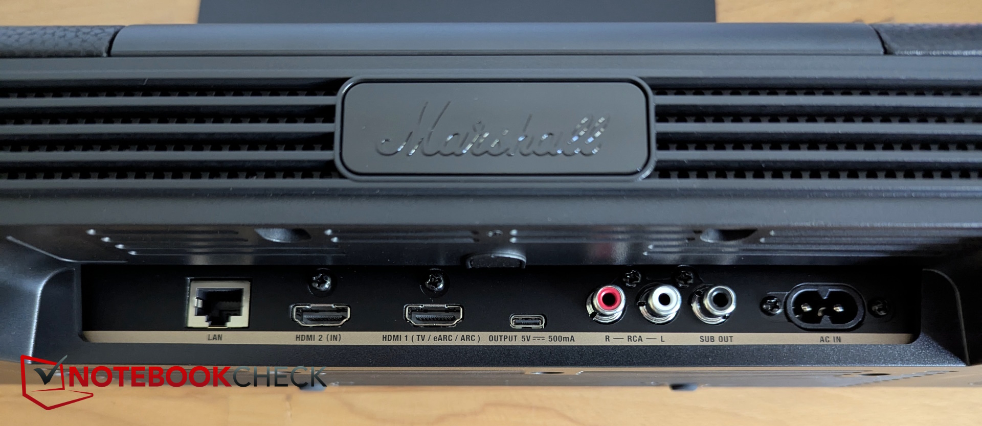 Ebenfalls sehr gut gelungen ist Marshall einmal mehr das Design. Hier hat man endlich ein Modell, das man gerne im Wohnzimmer platziert und das wohl auch einige Blicke und positive Nachfragen von Besuchern auf sich ziehen wird und damit ein positives Gegenbeispiel zum sonstigen Einheitsbrei der schwarzen Plastik-Soundbars darstellt.