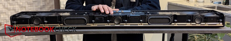 An der Oberseite sitzen jeweils seitlich die beiden Mitteltöner, welche nach oben gerichtet sind. Jeweils daneben befinden sich die Tweeter, die ihren Sound schräg nach oben an die Decke strahlen, welcher so reflektiert beim Hörer ankommt. Zudem sitzen noch zwei eigens konzipierte Tieftöner im Gehäuse, sie geben Frequenzen bis runter auf 40 Hz wieder und sorgen für den Wumms im Heston.
