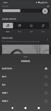 Stromkabel angeschlossen und schon kann es losgehen. Die Verbindung zum TV erfolgt via HDMI mit eARC/ARC. Wer zwischendurch vom Smartphone streamen möchte, stellt den Regler zur Quellenwahl auf Bluetooth, drückt den Regler herunter und verbindet sich mit dem Smartphone. Die App ist hierfür nicht unbedingt notwendig. Allerdings bemerken wir bei der Übertragung Latenzen zwischen Bild und Ton.