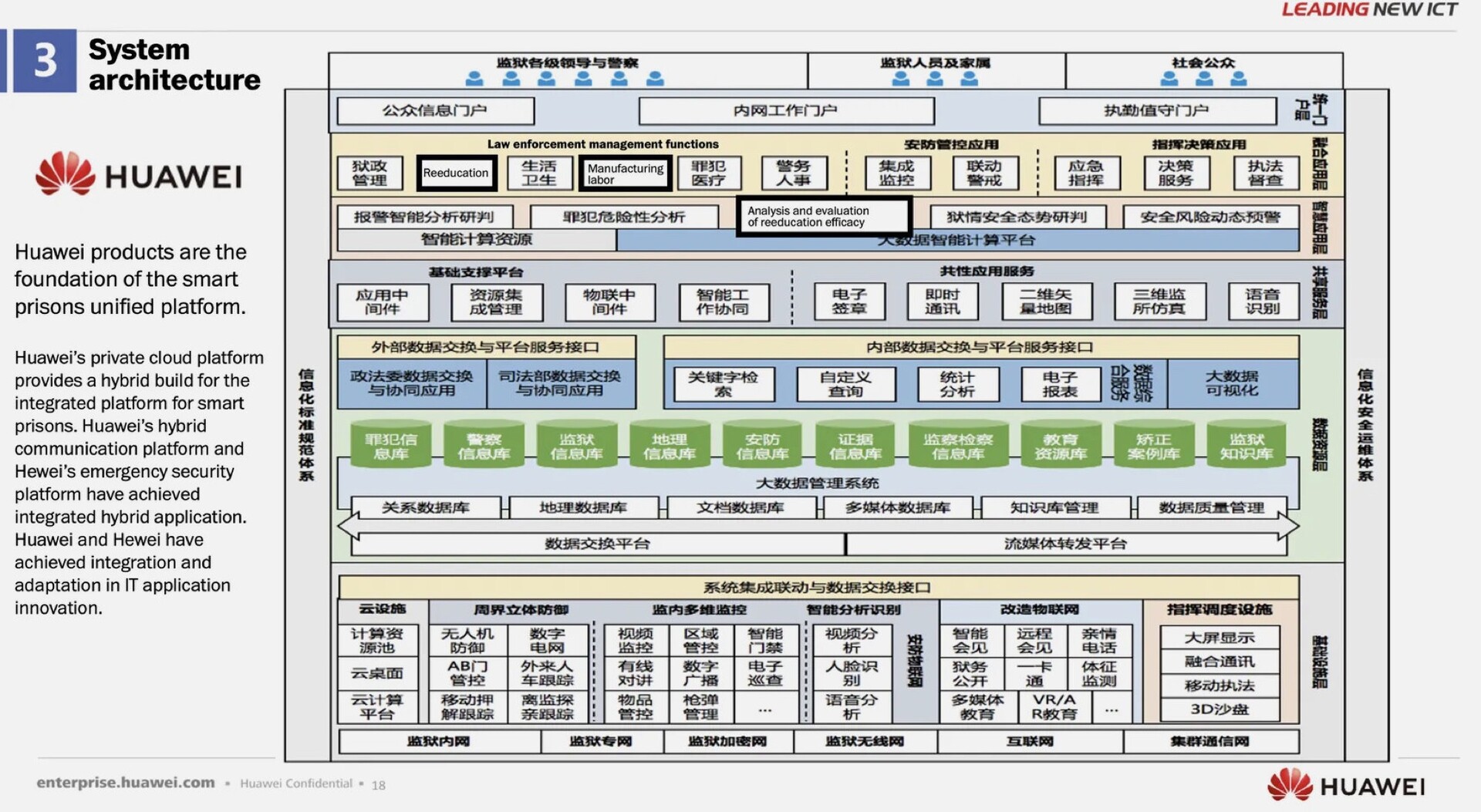 Eine der Folien beschreibt, wie die Technologien von Huawei das Herzstück der "smart prisons unified platform" wären. Laut dem Artikel der Washington Post geht es dabei um Technologie, die dazu genutzt wurde, bestimmte Personen einzusperren und sie Zwangsarbeit in Fabriken verrichten zu lassen. Neben Überwachungskameras und intelligenten Toren soll Huawei auch Software entwickelt haben, um die Zeitpläne dieser Gefangenen zu handhaben und um so die Arbeit und die "ideologische Umerziehung" effizienter zu handhaben.