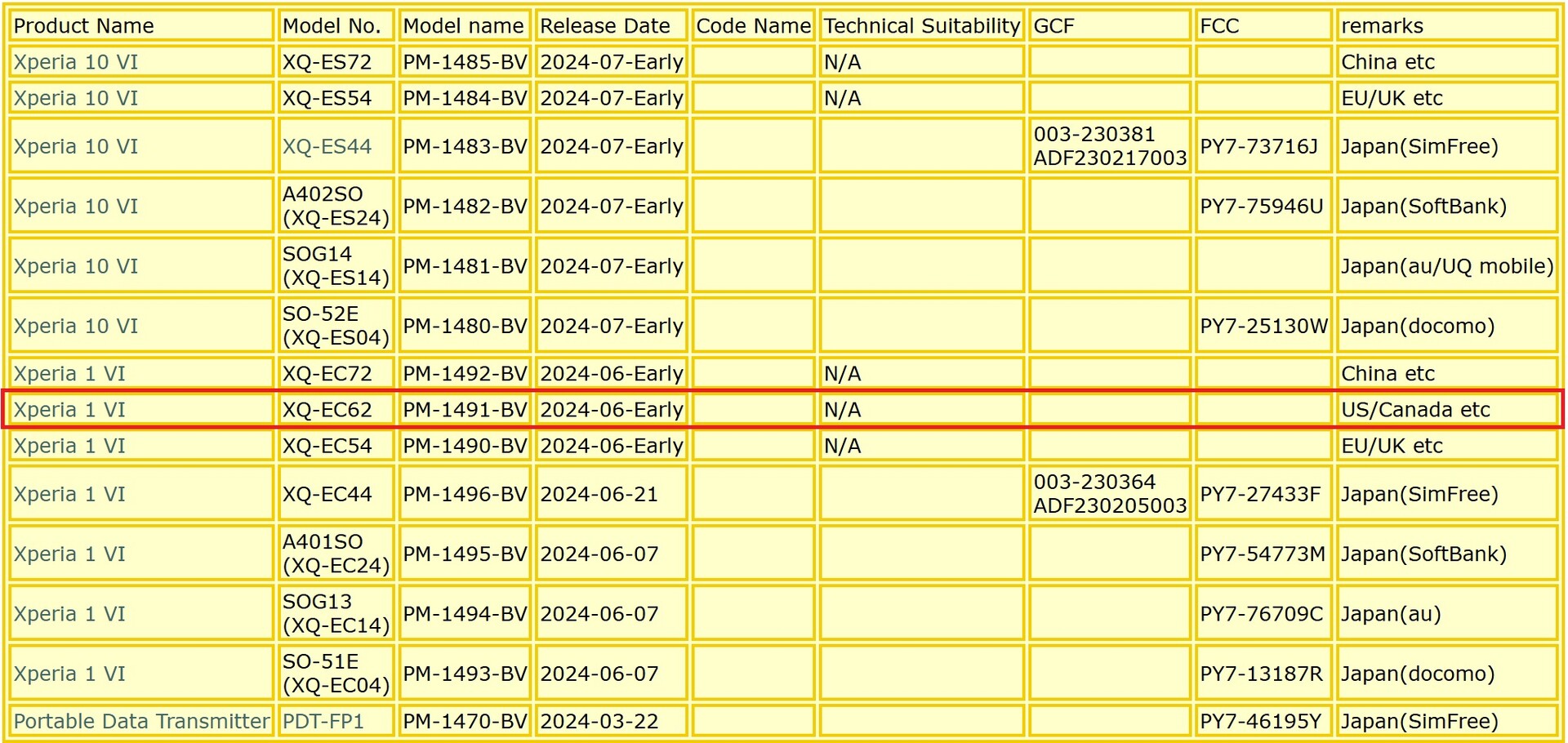 Man könnte vermuten, dass das Flaggschiff Xperia 1 mehr Marktversionen erhält als das Mittelklassemodell Xperia 10 – und genau das scheint sich auch in der geleakten Liste der Modellnummern widerzuspiegeln. Sollte diese Annahme zutreffen, würden die Nummern PM-1510 bis PM-1515 zum Xperia 1 VII gehören, während PM-1500 bis PM-1505 für das Xperia 10 VII stehen würden – ganz im Stil der bisherigen Nummerierung. Das ist nicht unerheblich, denn wie bereits angedeutet, kann eine kleinere Zahl an Modellvarianten auf eine begrenzte Markteinführung hindeuten. Viele Fans hoffen zumindest auf einen offiziellen Marktstart des Xperia 1 VII in den USA. Weder das Xperia 1 VI noch das Xperia 10 VI wurden dort oder in Kanada (also dem nordamerikanischen Markt) offiziell veröffentlicht – obwohl es Hinweise auf eine mögliche, dann aber offenbar gestrichene, US-Version des Xperia 1 VI mit der Bezeichnung PM-1491-BV gibt.