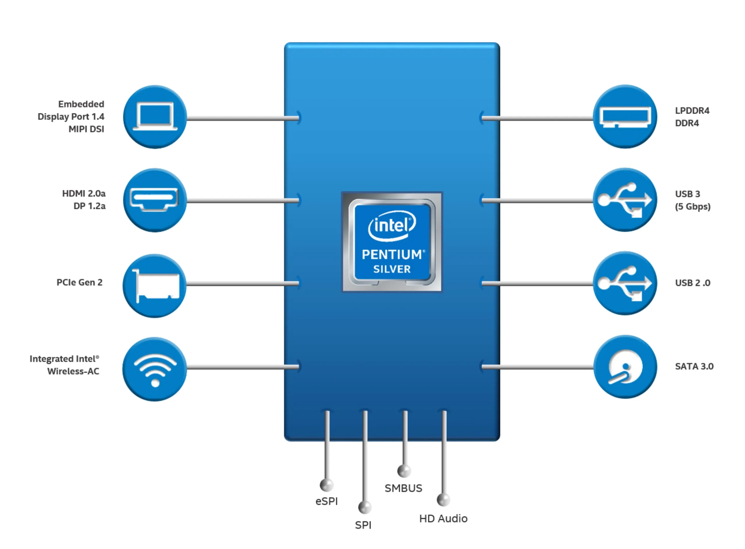 Die neuen Pentium und Celeron SoCs (System on a Chip) integrieren weiterhin zwei bzw. vier Goldmont Plus Kerne die nun mit bis zu 3,1 GHz getaktet werden (Pentium Silver Topmodell bei Einzelkernlast). Der Dual-Channel-Speichercontroller läuft weiterhin mit maximal 2400 MHz (DDR4 und LPDDR4) und auch die integrierte Grafikkarte (Intel UHD Graphics 600/605) bleibt gleich. Durch die höheren Taktraten, darf man eine leicht höhere Performance erwarten (besonders der N5030 profitiert durch einen deutlicheren Sprung). Trotzdem, bleibt die Leistung im absoluten Einsteigersegment und besonders in Verbindung mit langsamen Speichermedien (HDD oder eMMC) und wenig RAM (4 GB) bleibt man hier spürbar hinter den Y-Modellen (z.b. Comet Lake oder Ice Lake) zurück.