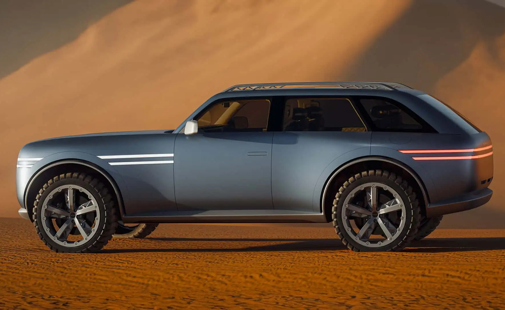 Die Konzeptstudie X Gran Equator zeigt in diese Richtung: große Offroad-Räder, kantige Radhausverkleidungen, eine geteilte Heckklappe, integrierte Dachträger und Zusatzbeleuchtung. Der Innenraum ist auf vier Einzelsitze ausgelegt, ergänzt durch vier separate Dachfenster. Genesis verbindet laut Road and Track minimalistisches Design mit digitalen Anzeigen.